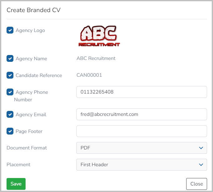 Select the options you would like for the branded CV then press the![](https://1771634726-files.gitbook.io/~/files/v0/b/gitbook-x-prod.appspot.com/o/spaces%2F4iyyoX6EJroqwfH056WE%2Fuploads%2FwCnSHItDvUO3gVZFesC6%2Fimage.png?alt=media\&token=c2f9db12-d2b6-42d0-9aac-f023563d956e)button.