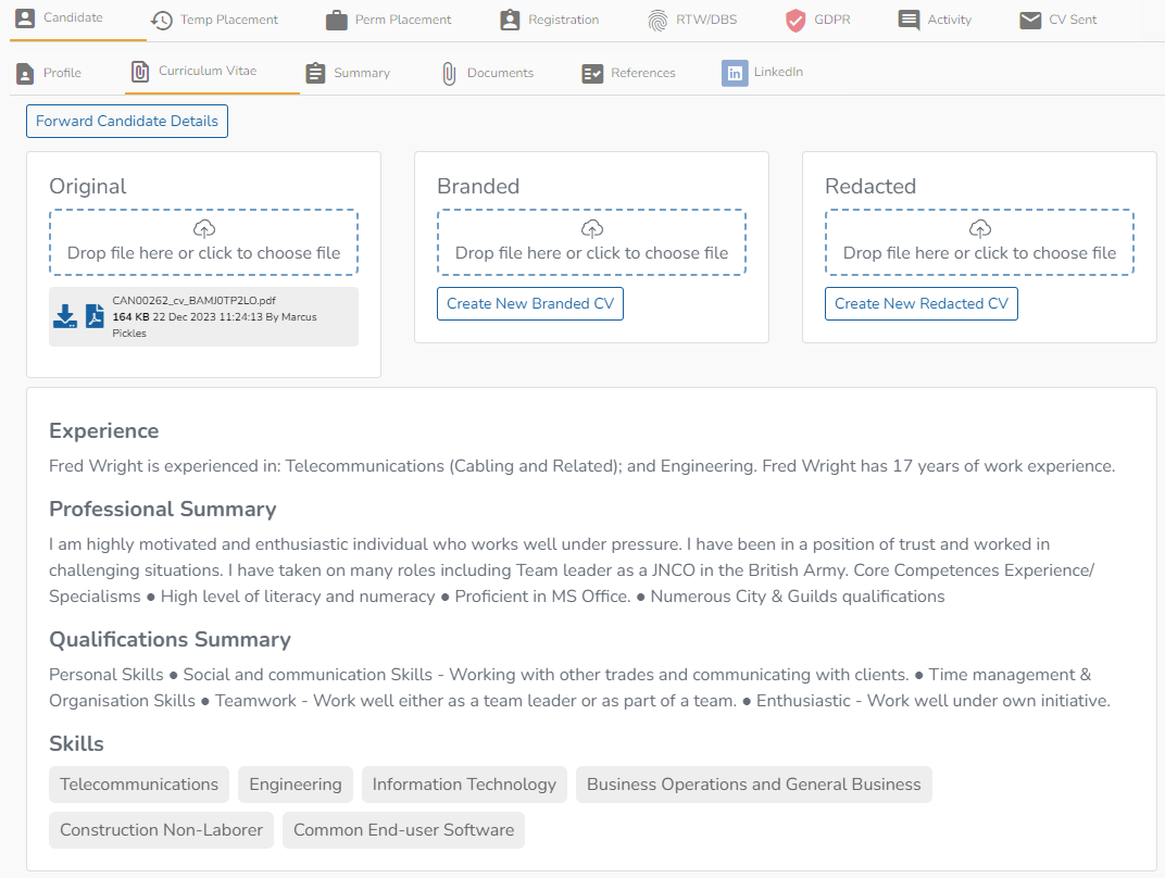 The CV parser will generate summary information using the extracted data as shown in this example: