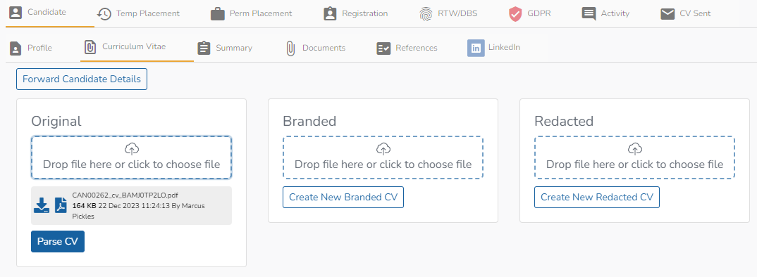 To create a new branded or redacted version of the candidate's CV you will first need to parse the original CV file.